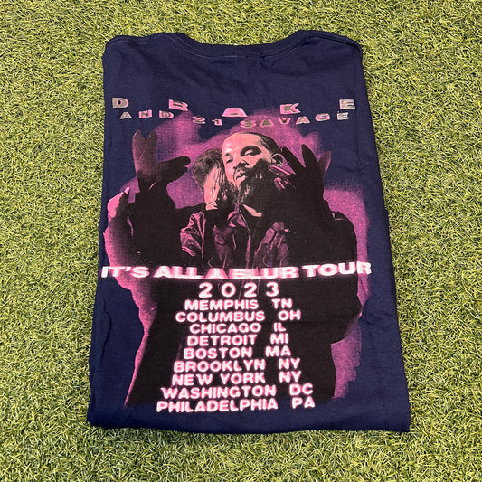 Drake & 21 Savage Bootleg It's All A Blur Tour 2023 Navy Tee Size Large NEW x8140