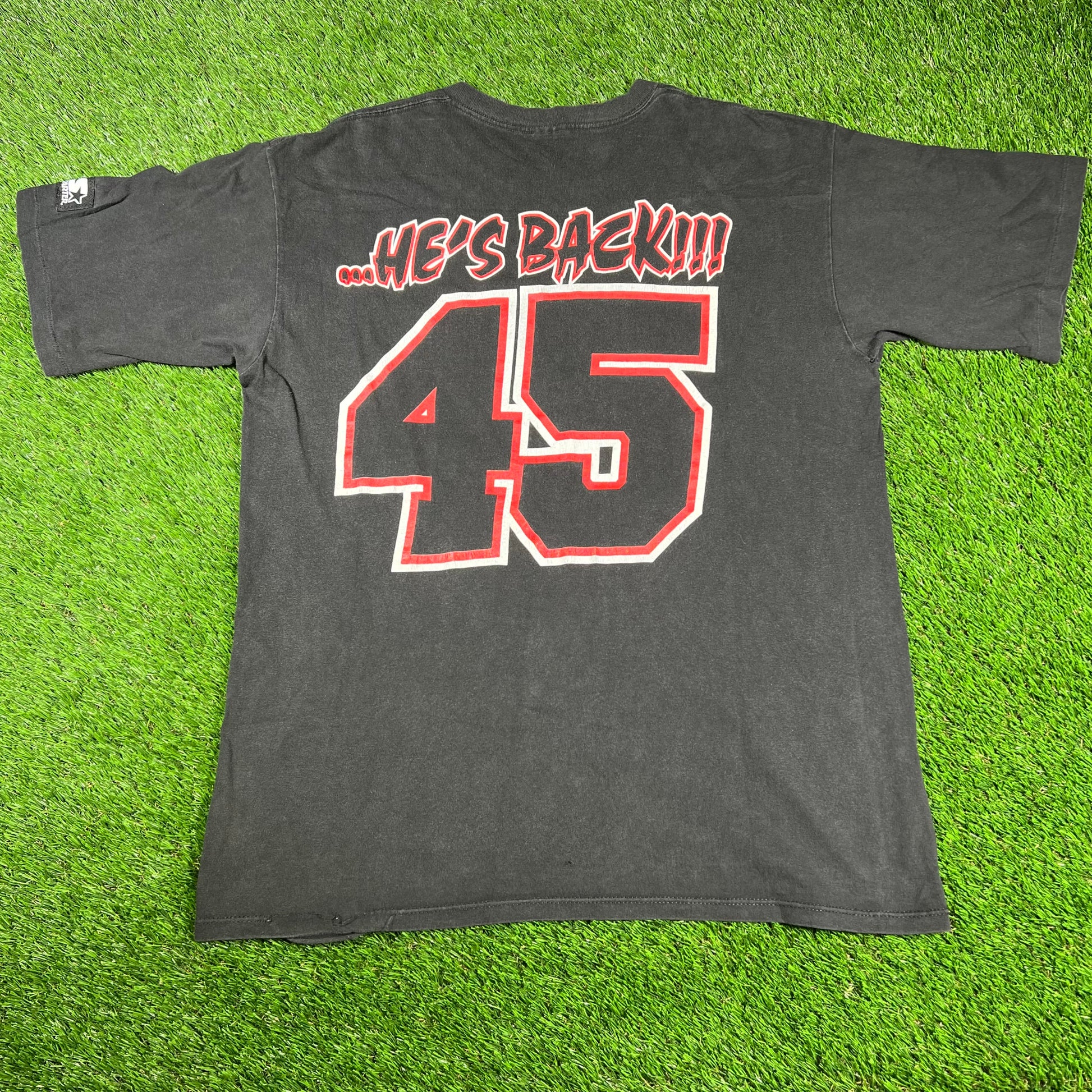 1990s Michael Jordan Hes Back 45 Black Starter Tee Size Large USED v16719
