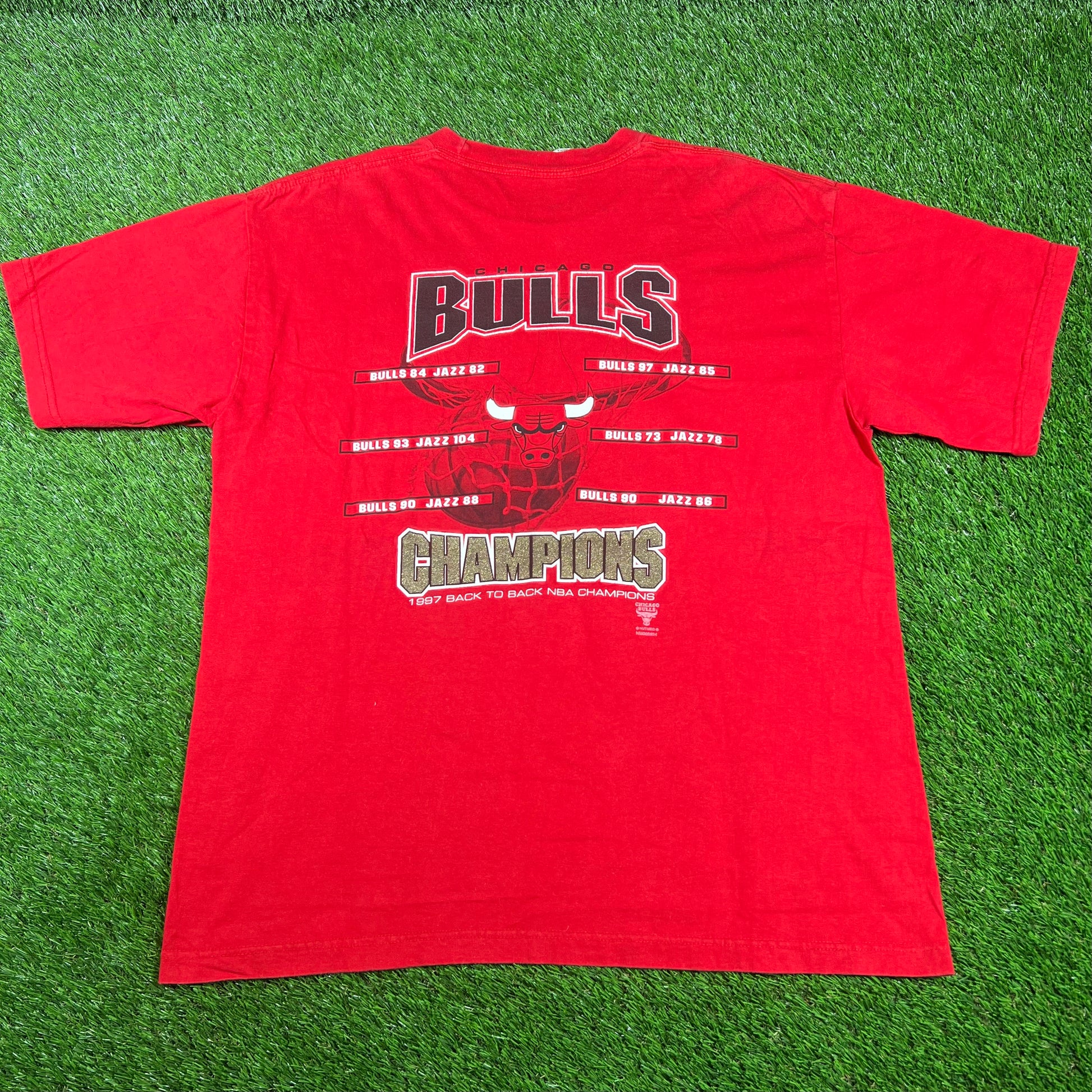 1997 Chicago Bulls NBA Finals Back to Back Champ Tag Red Tee Size XL USED v16728