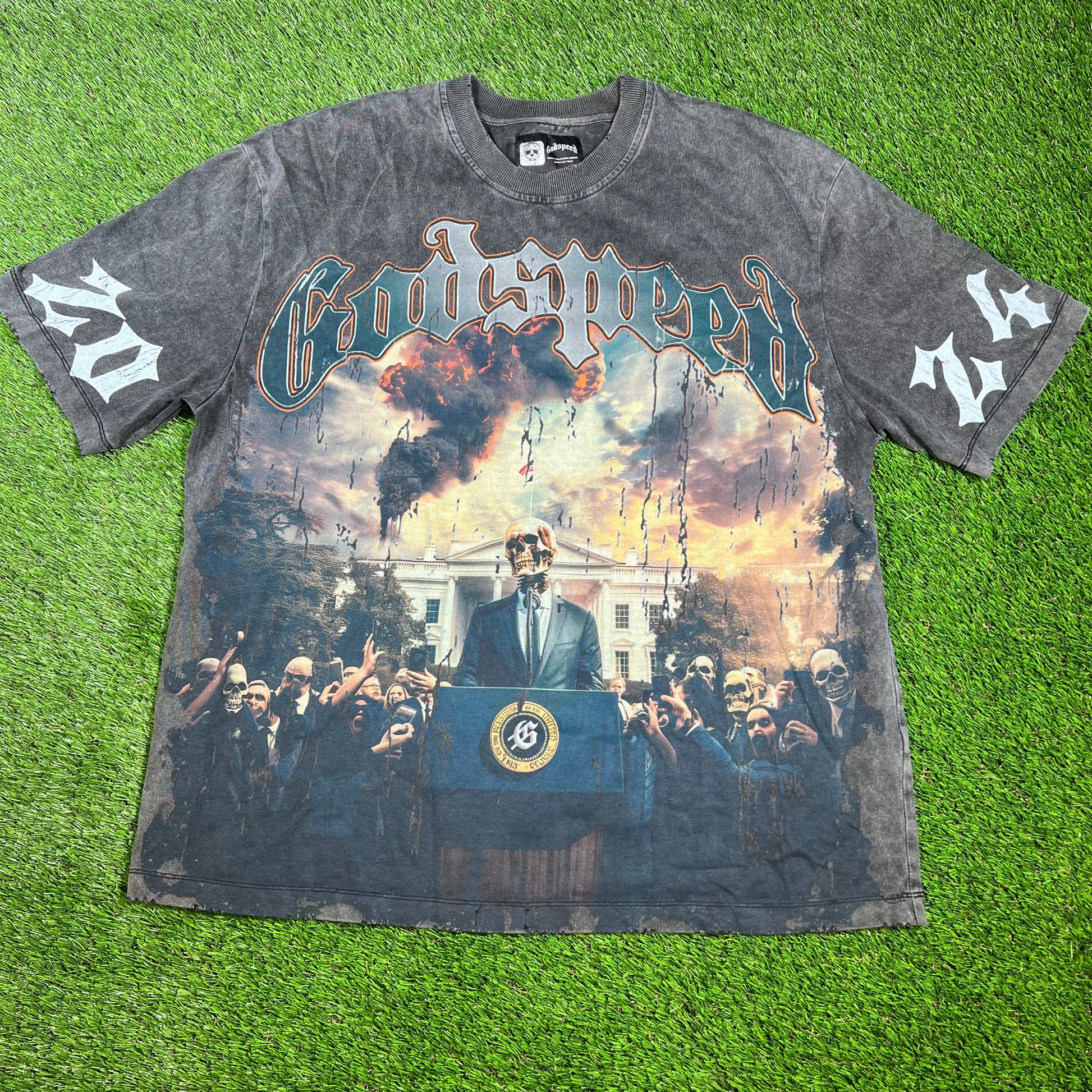 Godspeed Skull President Press Conference Black Tee Size Large USED x14290