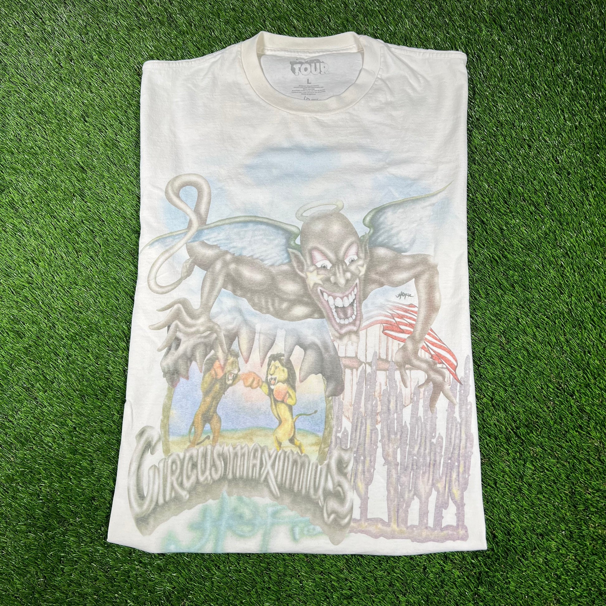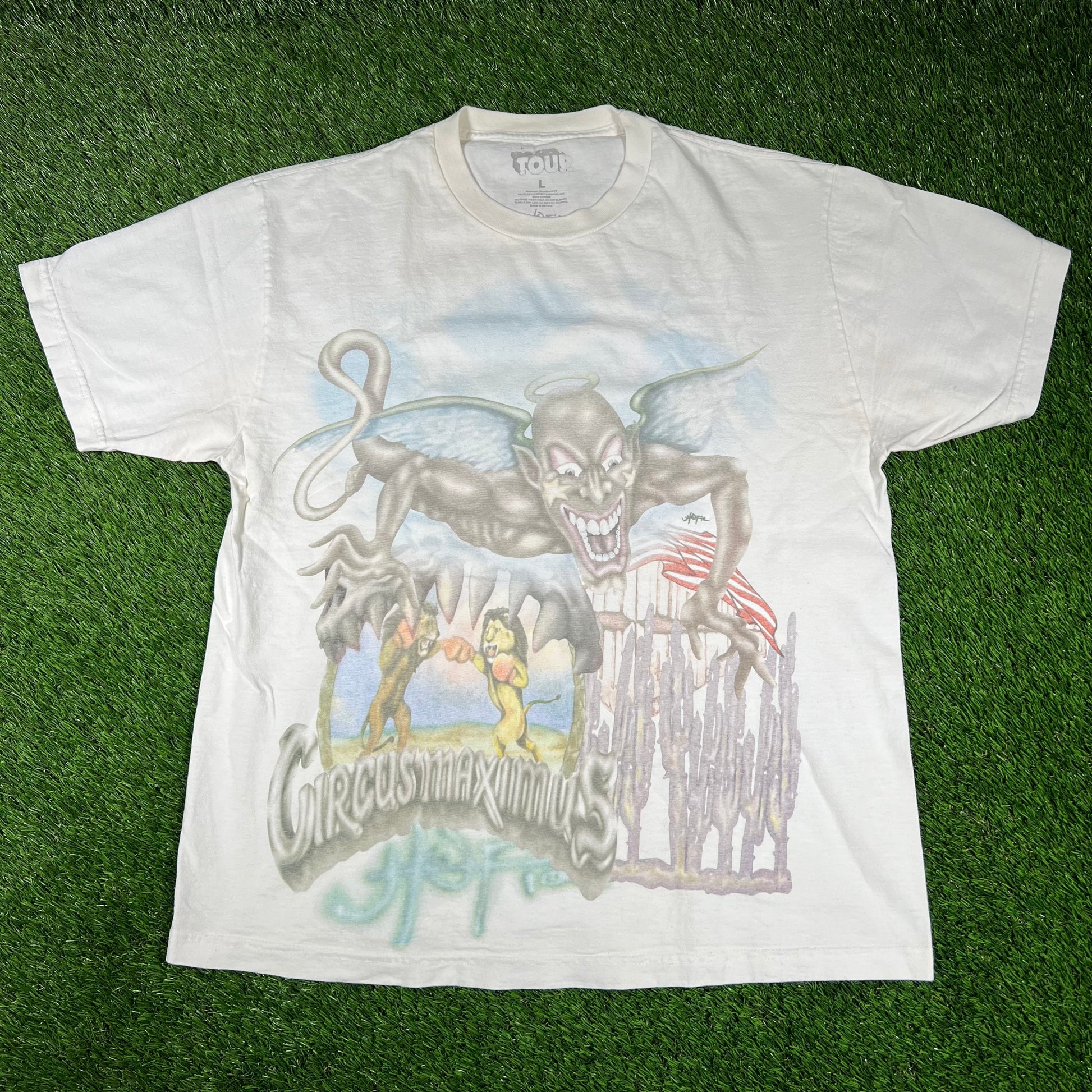 Travis Scott Circus Maximus White Strongman Tee Size Large USED x14493