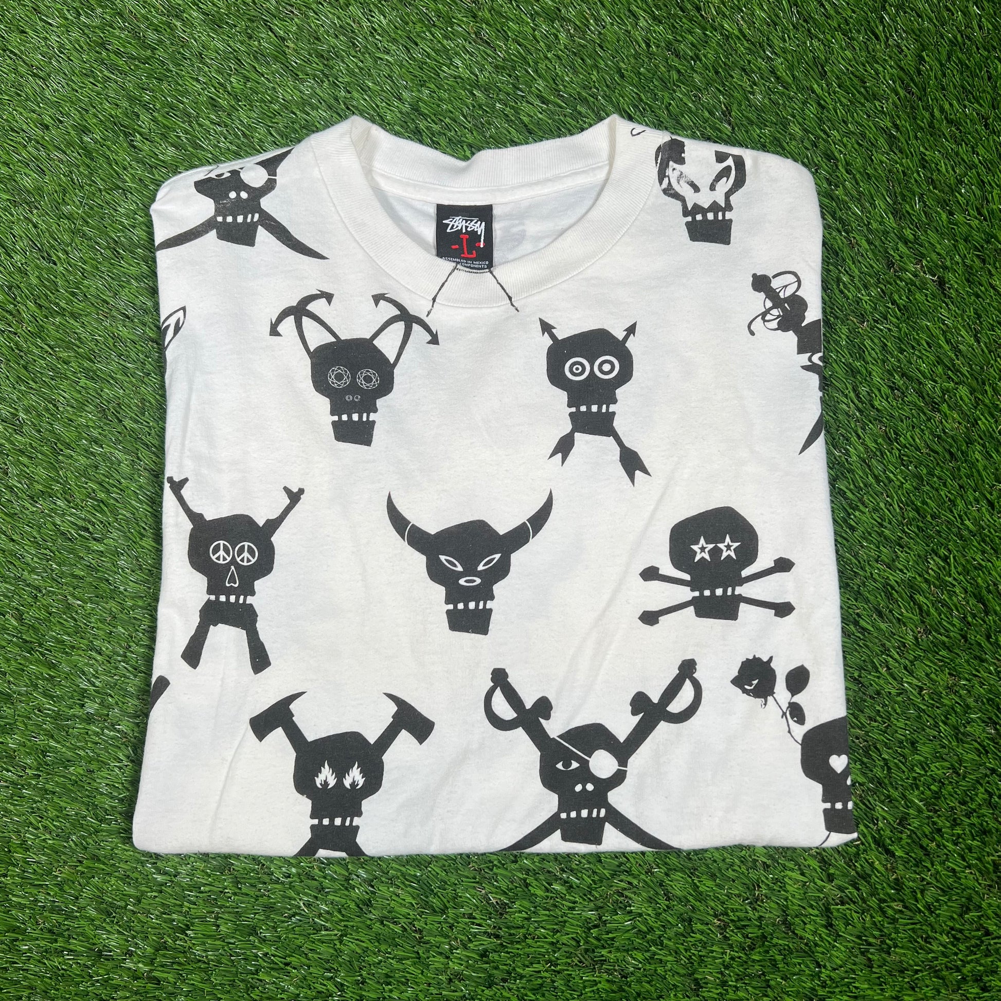 Y2K Stussy Futura Skulls AOP White Tee Size Large USED x14401